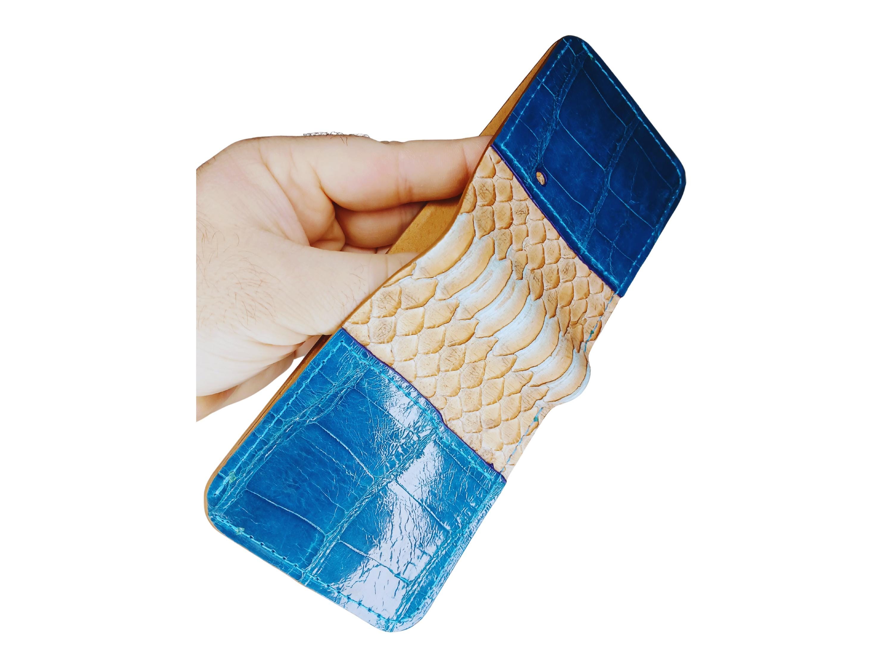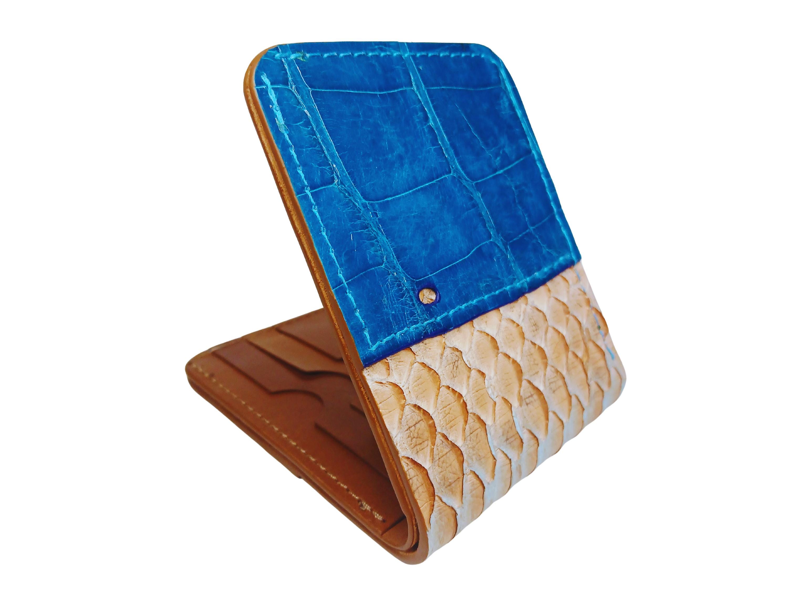 Glazed Tahiti Blue American Alligator with Baby Blue / Peach Python Inlay. Glazed Cognac Kangaroo interior.