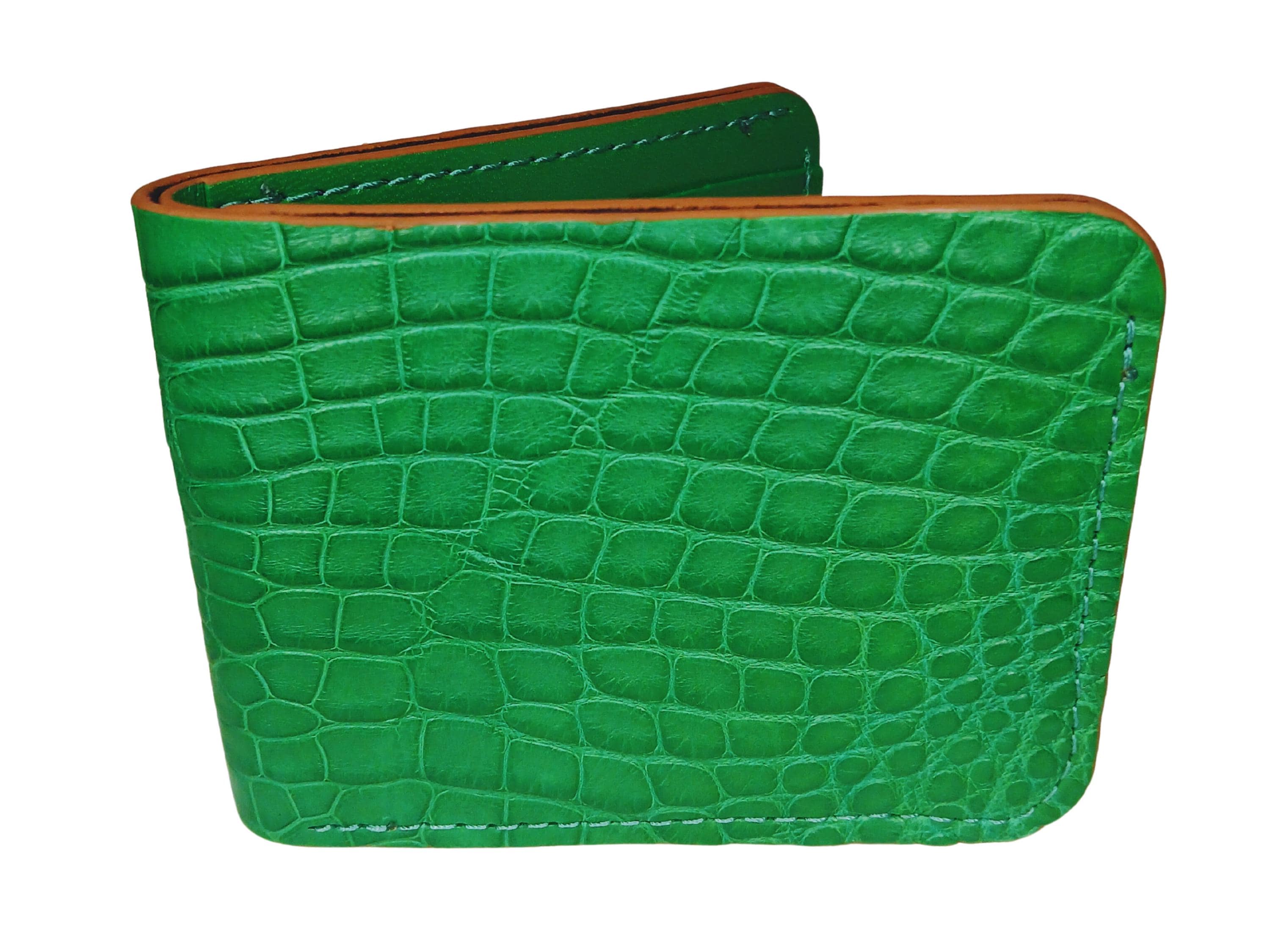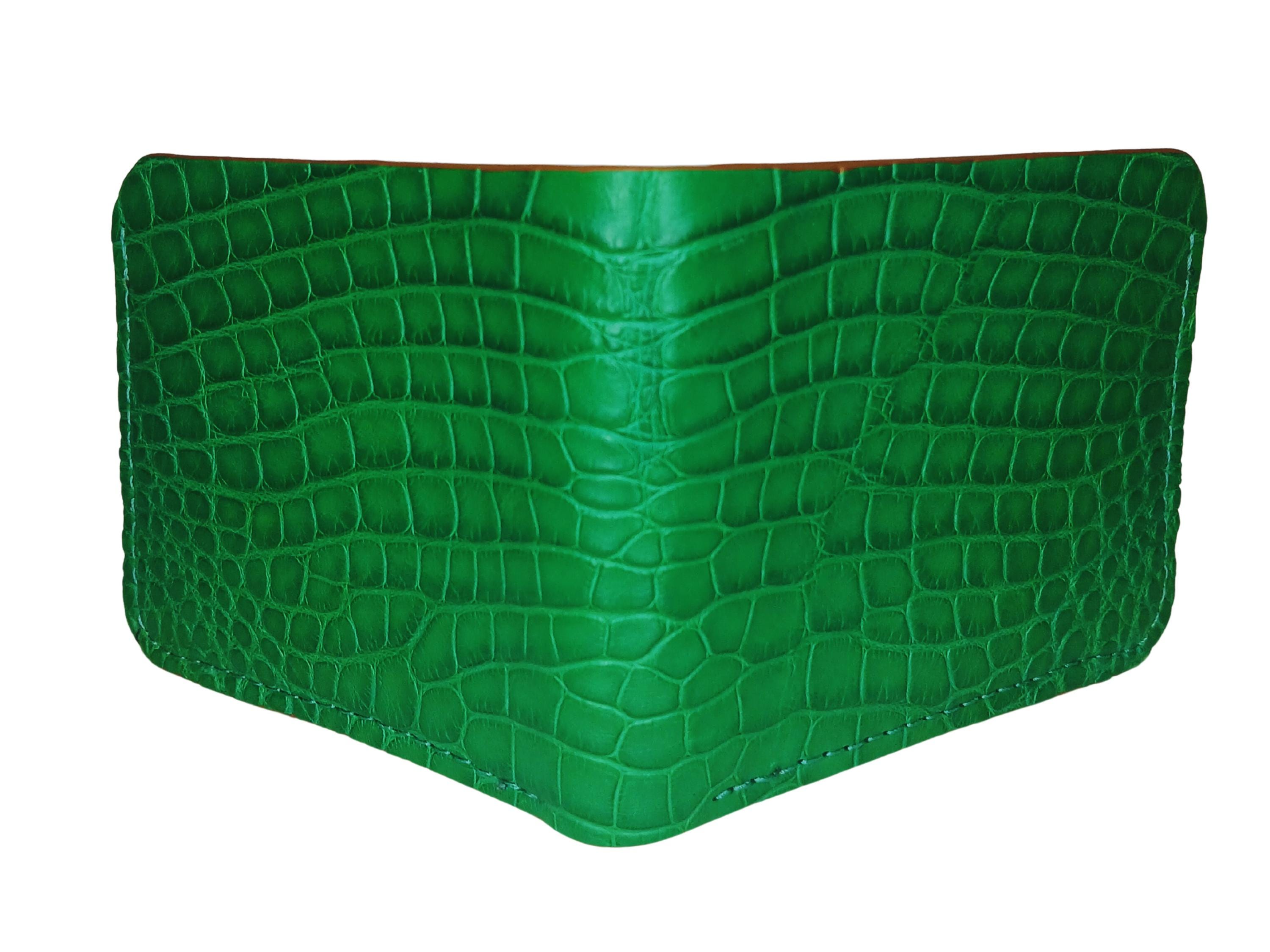Matte Kelly Green American Alligator Bifold Wallet with Green Shrut and Asch Finished Kidskin Interior.